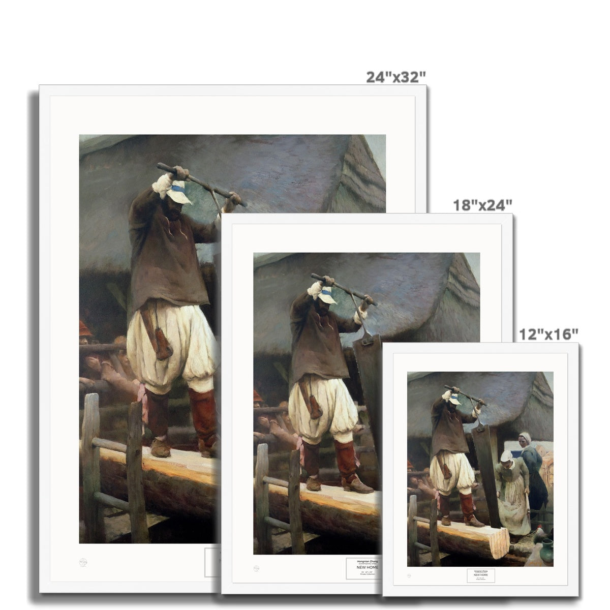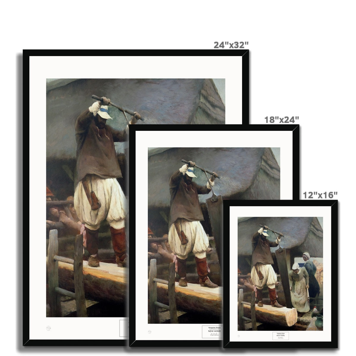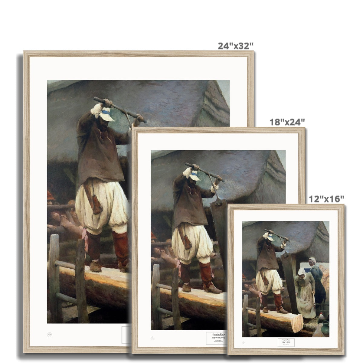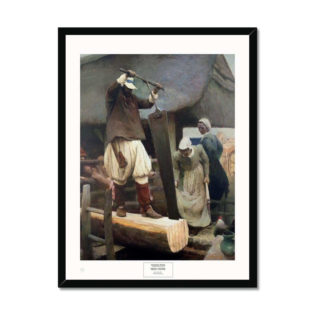 "New Home" is an evocative painting by award-winning artist Hongnian Zhang that captures a timeless scene of industriousness as settlers work together to build their new home. Zhang’s expert use of light and shadow emphasizes the strength and dedication of the figures. It's a timeless message that still feels relevant today. Your reproduction is printed on a museum-quality, fine-art paper using giclée techniques. The item is framed and delivered ready to hang.