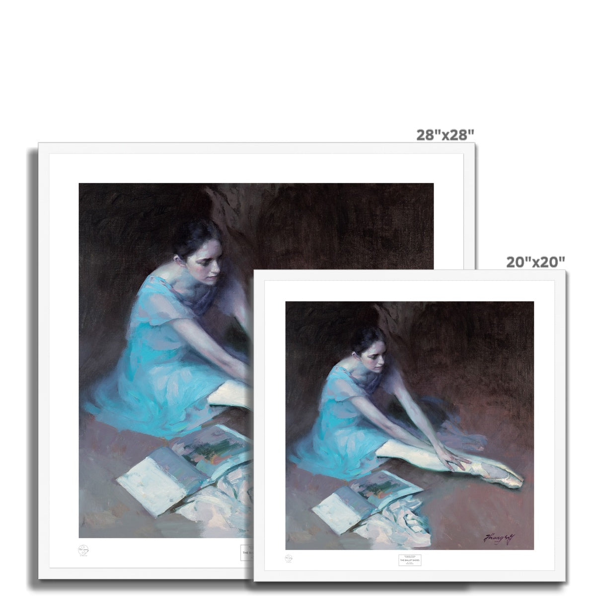 Bring home the elegance and strength of the human spirit with a reproduction of "The Ballet Shoes" by award-winning, artist Hongnian Zhang. The stunning oil painting captures a poignant moment of quiet focus, as a young ballerina stretches in preparation. Her expression reflecting the intensity of her determination.